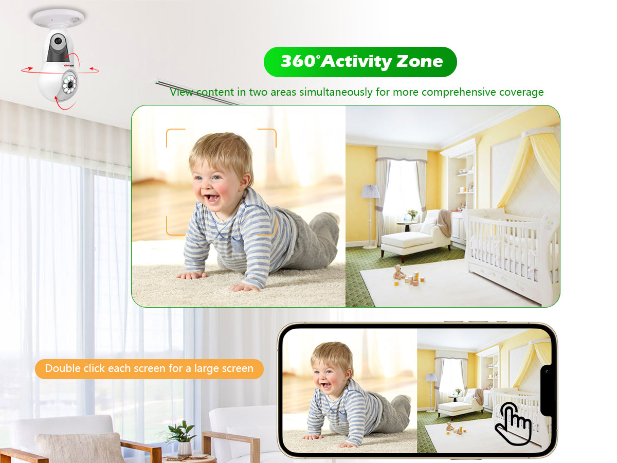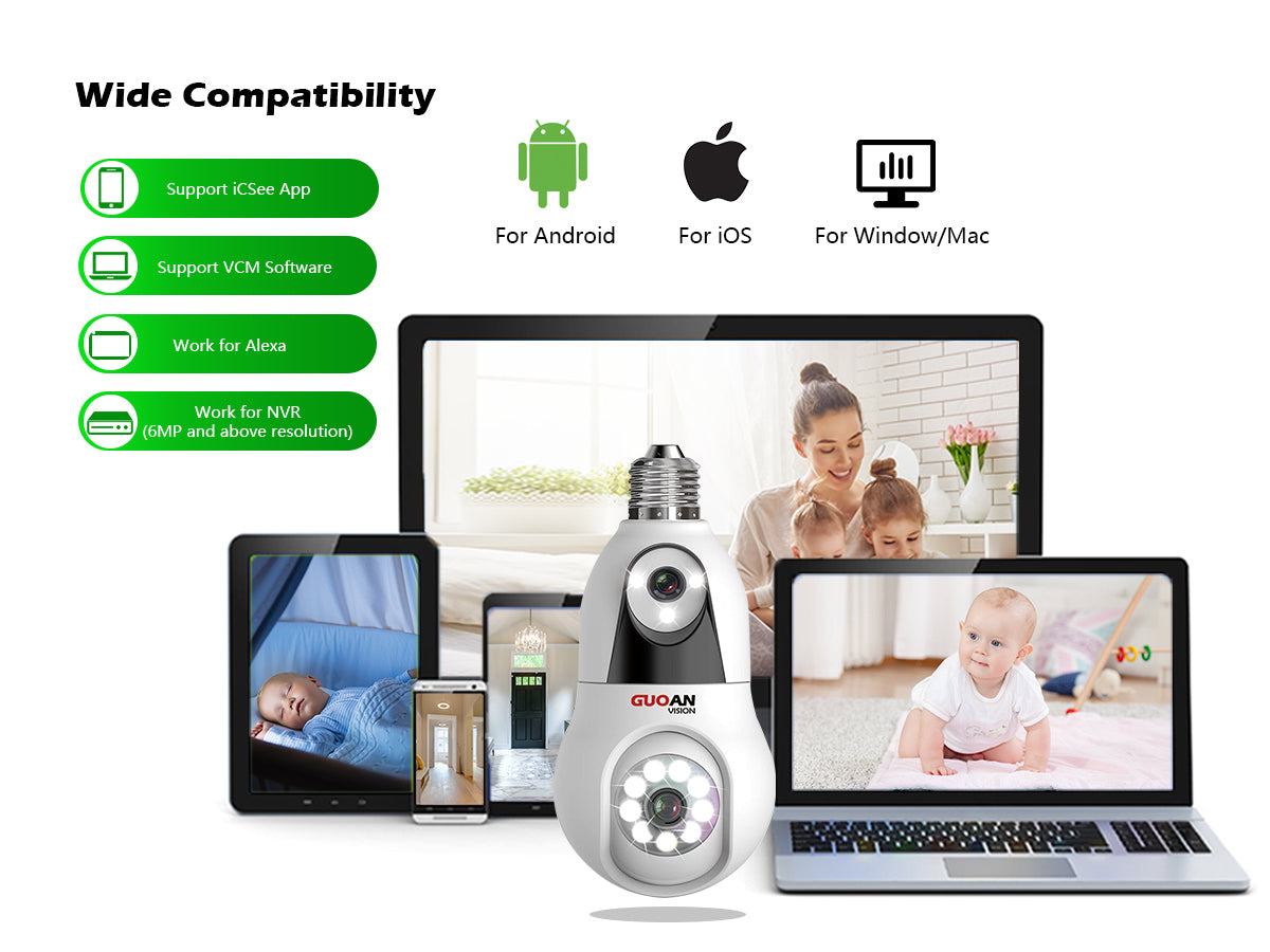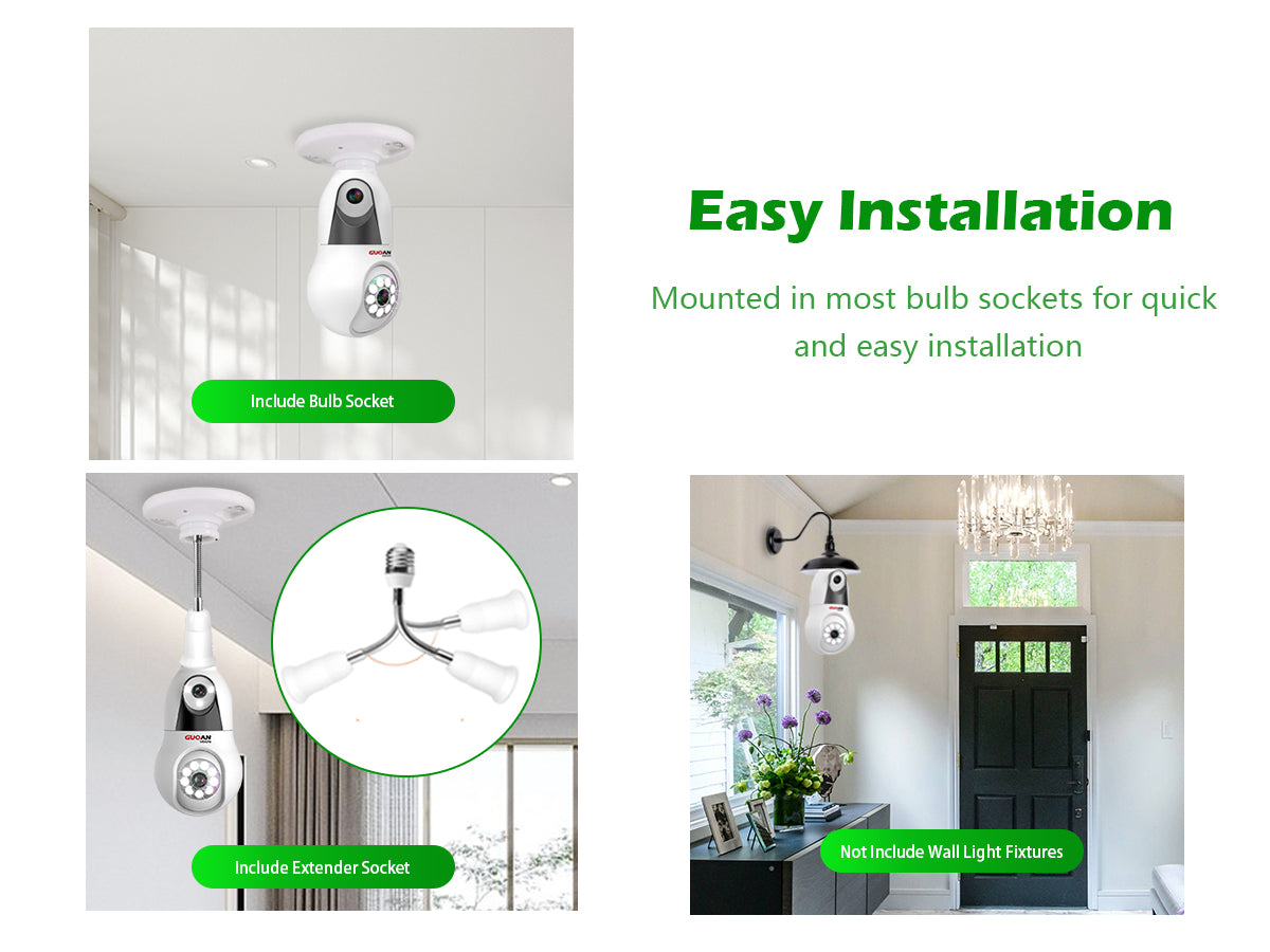 - 【6MP UHD Image with Starlight Night Vision】Guoanvision lightbulbs security camera offers 2x 3MP ultra HD to make sure an superior day and advanced color night vision. Dual screens display two area with a key area and patrol area. Wireless bulbs camera features infrared/full color/ dual light mode, which ensure that objects within 30 feets can be clearly monitored.